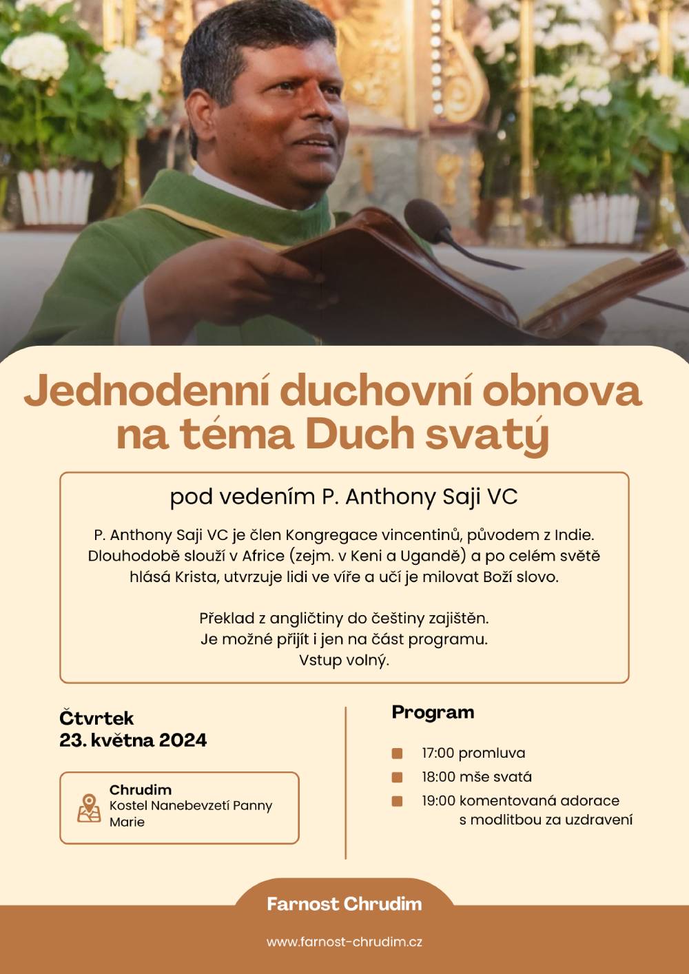 Ve čtvrtek 23. května zveme na podvečerní duchovní obnovu pod vedením P. Anthony Saji, člena kongregace vincentinů. Otec Anthony více než deset let vede exercicie po celém světě, dlouhodobě slouží v Keni a Ugandě. Duchovní obnova bude probíhat v kostele Nanebevzetí Panny Marie, začne v 17 hodin promluvou otce Anthonyho, v 18 hodin bude mše svatá a po ní komentovaná adorace s modlitbou za uzdravení. Překlad z angličtiny do češtiny je zajištěn. Je možné přijít i jen na část programu.