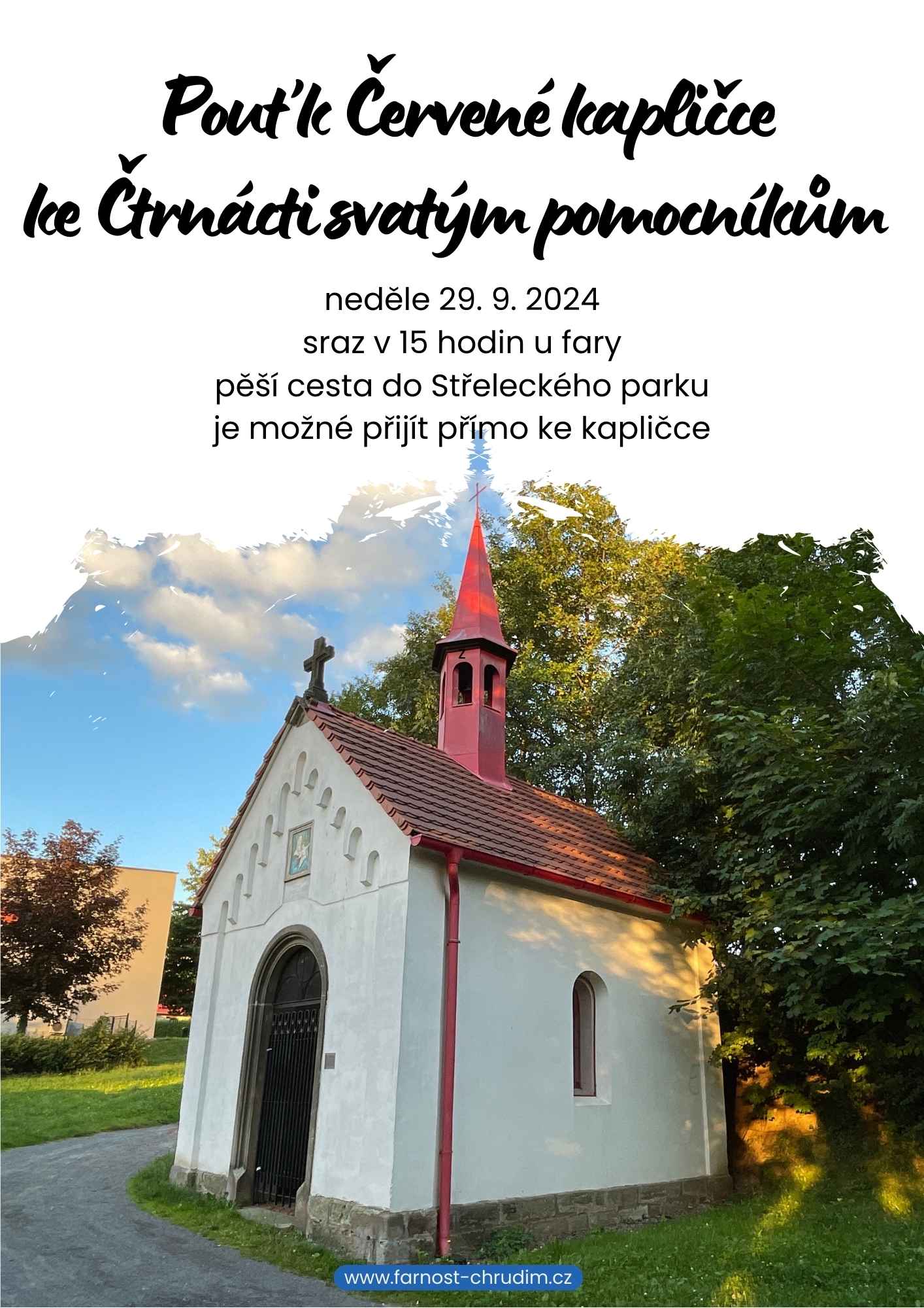 Tuto neděli se vydáme na pouť ke Čtrnácti svatým pomocníkům do Červené kapličky ve Střeleckém parku. Ti se osvědčili jako účinní pomocníci v různých nemocech, protivenstvích, strachu, úzkosti a nesnázích. Také my je chceme prosit o přímluvu v našich starostech. Vyjdeme od fary v 15 hodin.