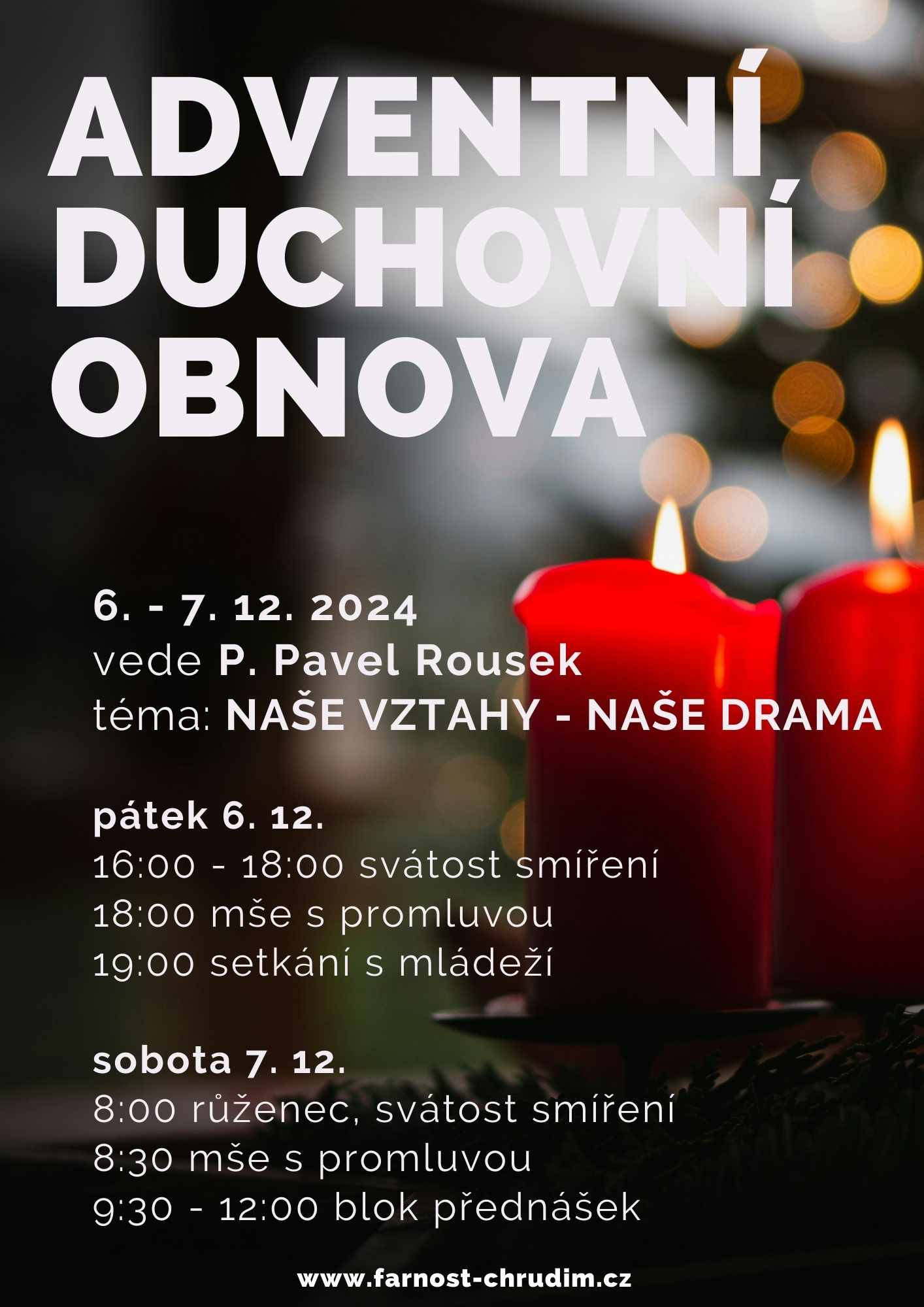 Adventní duchovní obnova bude v pátek 6. a v sobotu 7. 12. Vede P. Pavel Rousek.