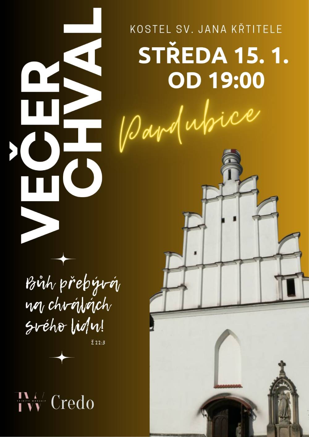 S radostí Vás také zveme na první večer chval v Pardubicích a to příští středu 15. ledna 2025 od 19:00 v kostelíku sv. Jana Křtitele.