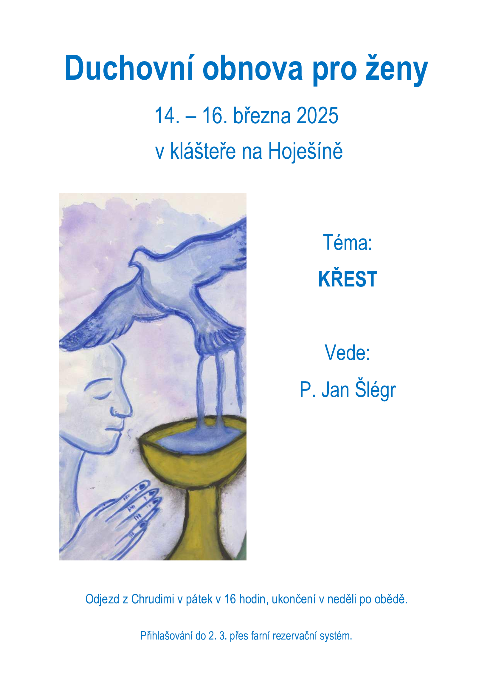 Zveme na duchovní obnovu pro ženy, která bude v termínu 14. - 16. 3. na Hoješíně. Téma: Křest, vede otec Jan. Přihlašování přes farní rezervační systém.