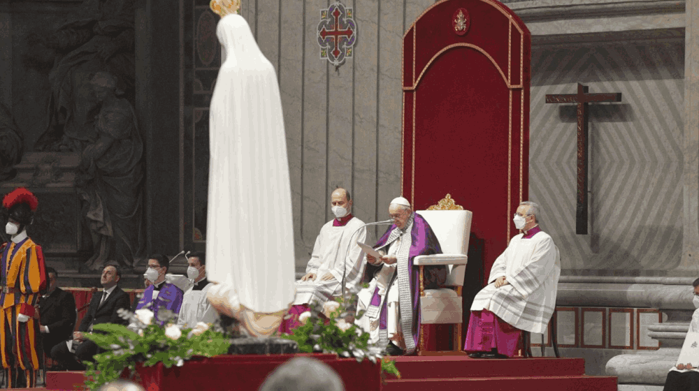 Rovněž my tedy klepejme na ono Srdce poté, co nás obnovilo odpuštění. Ve spojení s biskupy a věřícími celého světa bych rád slavnostně předložil Neposkvrněnému Mariinu Srdci vše, co prožíváme; znovu Marii zasvětil církev a celé lidstvo a zvláště národy Ukrajiny a Ruska, které ji se synovskou úctou uctívají jako Matku. Nejde o magické zaříkávání, ale o duchovní úkon. Je to gesto naprostého svěření dětí, které se v soužení této kruté a nesmyslné války, ohrožující svět, utíkají k Matce, jako vyděšené děti, které se jdou k mamince vyplakat a hledat u ní ochranu. Uchylujeme se k Matce, vyléváme do jejího Srdce svůj strach i bolest a odevzdáváme se jí. Vkládáme do tohoto čirého, nedotčeného Srdce, v němž se zrcadlí Bůh, cenné statky bratrství a pokoje, vše, co máme a čím jsme, aby nás Ona, Matka, kterou nám Pán daroval, chránila a opatrovala.